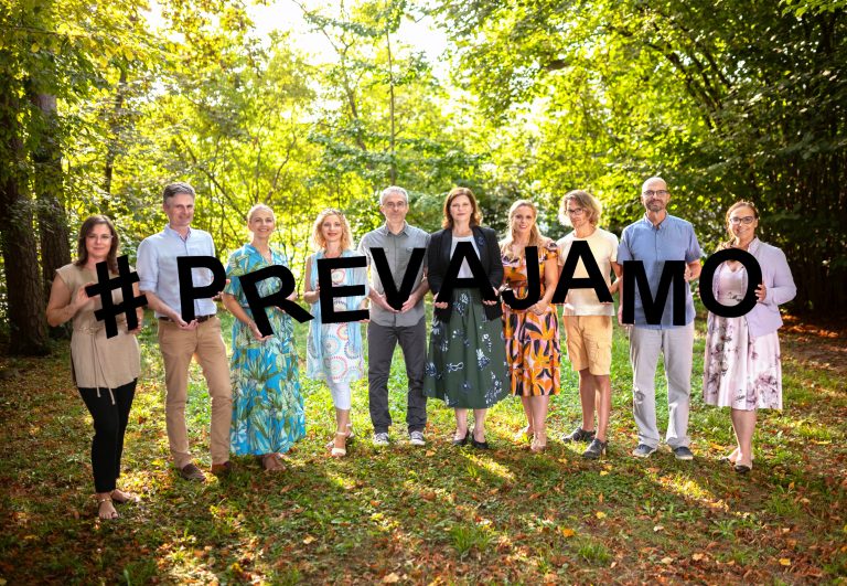 #prevajamo – Foto: Vid Brezočnik. Na sliki (od leve proti desni): Živa Malovrh (DZTPS), Simon Zupan (Oddelek za prevodoslovje FF UM), Lea Burjan (DPTS), Nataša Hirci (Oddelek za prevajalstvo FF UL), Denis Debevec (DSFTP), Viktorija Osolnik Kunc (Združenje SCIT®), Tanja Petrič (DSKP), Rok Dovjak (Lektorsko društvo Slovenije), Matjaž Juhart (ZKTS), Maja Sužnik (DZTPS).